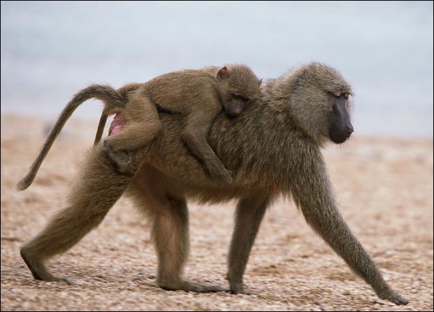 The baboon can be found in East Africa in high trees, savannahs, or sides of cliffs. Anywhere around a water source with a comfortable living area.They spend most of their time on the ground walking on all fours. They do not have a gripping tails like most monkeys do so they are not the greatest climbers but they still do climb trees. Most baboons range from 40 in to 70 in and weight up to 90 pounds. Males are predominantly larger than females, almost twice as large. Males are also much more aggressive. This is because they must defend their territory against other predators and also to fight for dominance over females. Even though females are half the size of males, they have almost the same appearance except for the males ruff around their neck (long hair around neck like a mane). Males tend to leave their troop and fight for hierarchy and mates in other troops. Females are the ones who stay in their same troops from life to death. The sexual dimorphism of females not having the ruff around their necks probably has to do with evolution. They have to carry their babies around on their stomach and backs so the ruff would just be in the way. Males leaving troops probably has to do with mating. If all the females in a troop are taken, the males must go to different troops to find mates. It is not necessarily environment factors but the species must be repopulated and if there is no inter troop breeding , then the species will eventually die down.